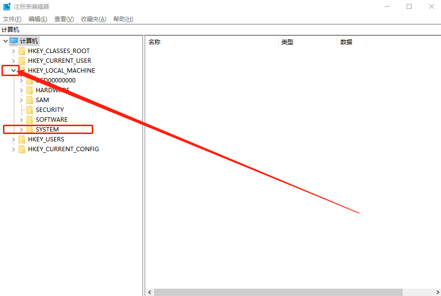 2、打开注册表编辑器后,首先点击“计算机”左侧的小图标展开计算机后,找到“HKEY_LOCAL_MACHINE”已同样的方式展开,找到“SYSTEM”。