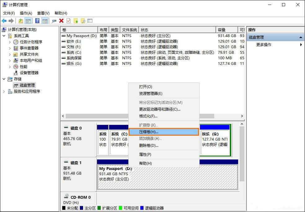 4、然后,右键移动硬盘选择“压缩卷”进行磁盘分区。