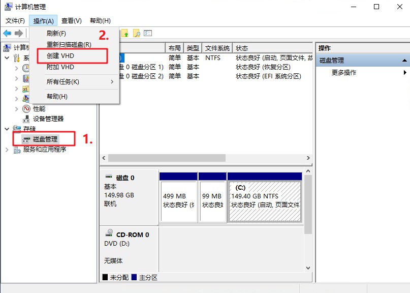 2、 在左侧的列表中,先选择“磁盘管理”,在顶部的操作菜单中选择“创建VHD”。