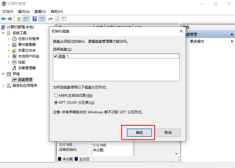 5、在弹出的初始化磁盘向导中点“确定”即可。