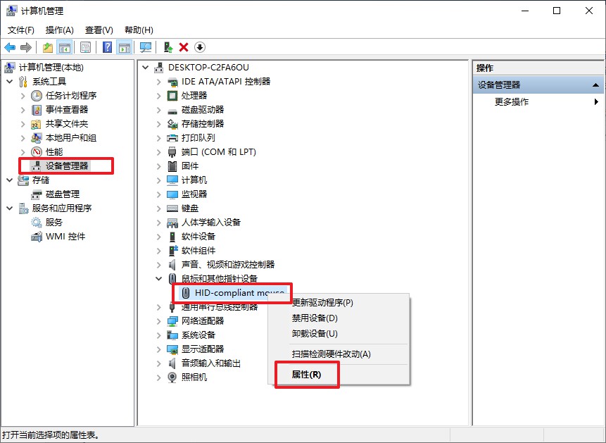 2、在设备管理器中找到鼠标设备,并打开其属性。