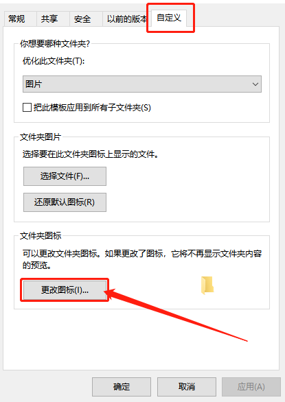 第二步:在属性页面,点击“自定义”选项卡,再点击“更改图标”