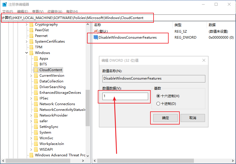 4、双击DisableWindowsConsumerFeatures,将其数值数据修改为1,然后点击“确定”保存设置。设置完毕后,需要进行电脑重启。
