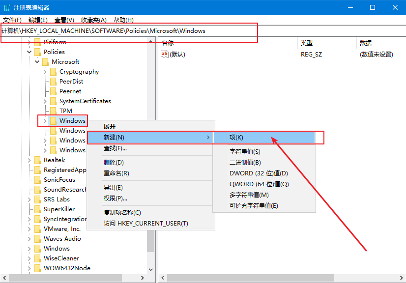 2、在注册表编辑器中,依次点击展开“HKEY_LOCAL_MACHINE\SOFTWARE\Policies\Microsoft\Windows”,在Windows项上点击鼠标右键新建名为CloudContent的子项。