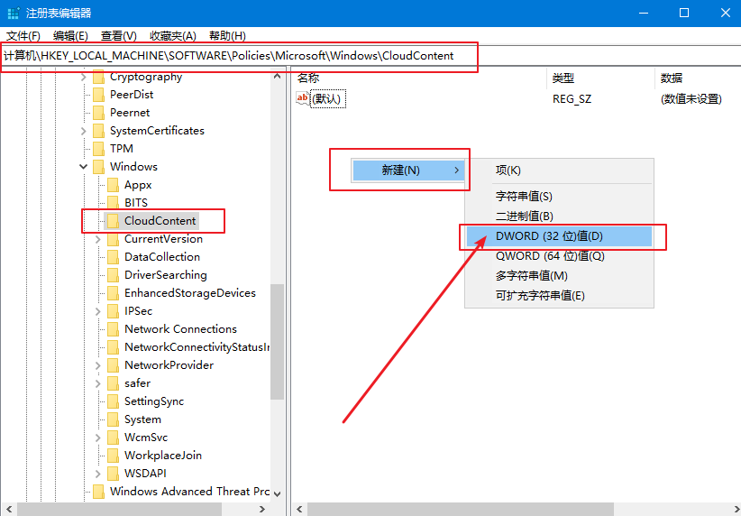 3、选中CloudContent项,在右边空白处,新建一个DWORD(32位)值,将其重命名为“DisableWindowsConsumerFeatures”。