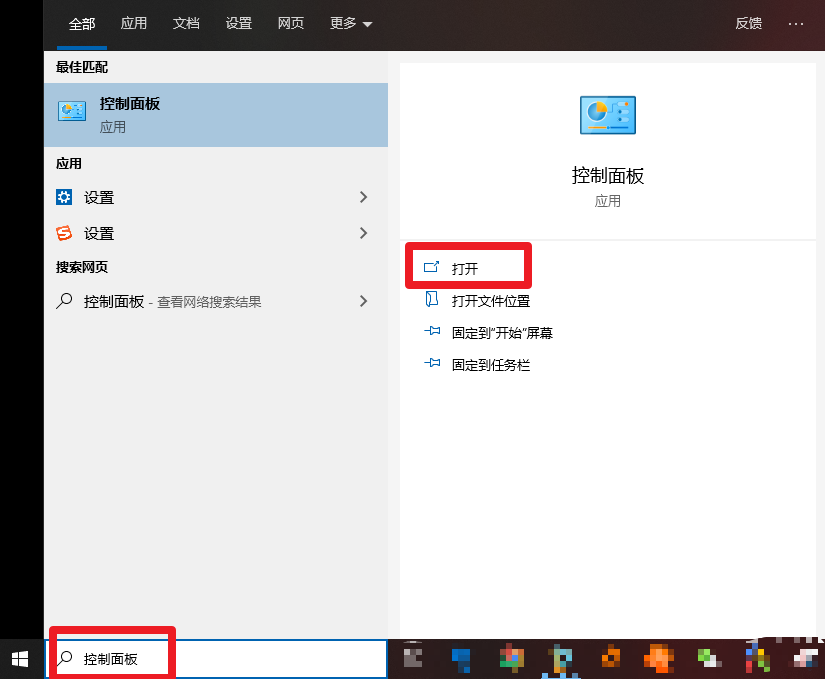 在桌面搜索框中输入 “控制面板”或者“Control”,并点击“打开”即可进入控制面板