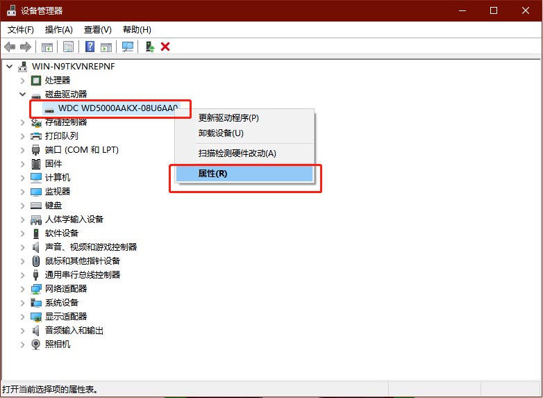 2、然后在设备管理器窗口中,展开磁盘驱动器,鼠标右键电脑硬盘,选择“属性”;