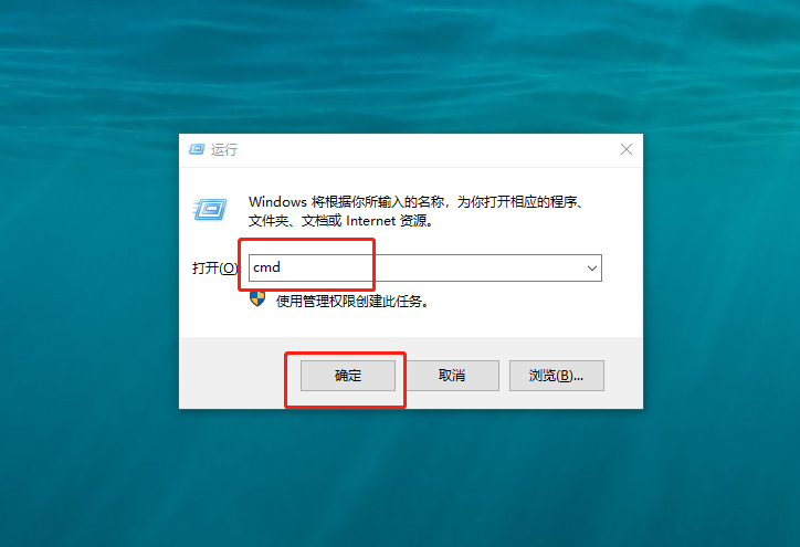 最后,还需要刷新组策略:同时按住【win+R】打开运行窗口,输入【cmd】并点击【确定】。