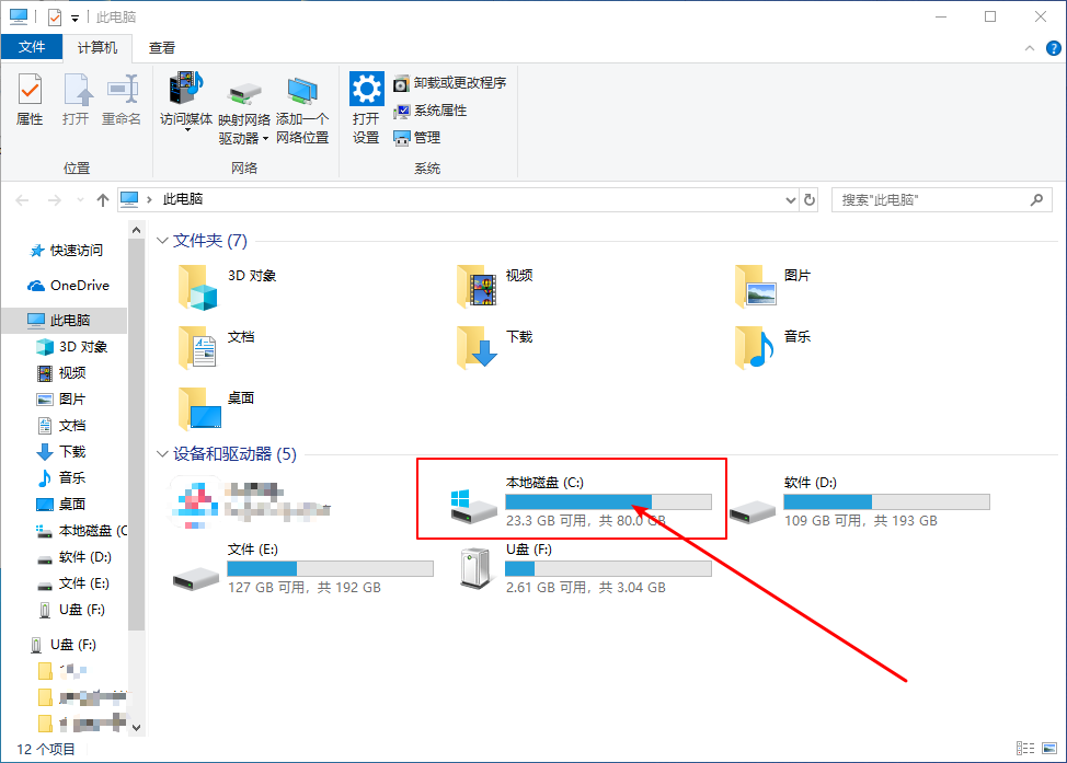 1、 进入“此电脑”,鼠标右击“C盘”选择“属性”