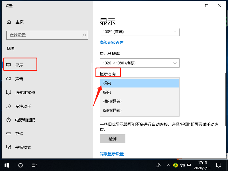2、然后在显示一栏中,我们找到显示方向,会发现我们选择的是纵向,将其改成横向即可。