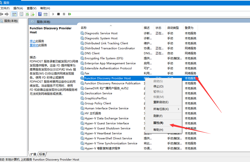 7、在弹出的窗口中找到Function Discovery Provide Host服务,右键点击属性。