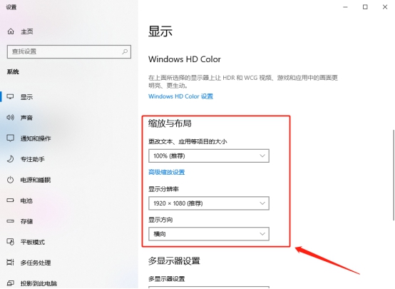 完成以上设置后,还可以点击对应的屏幕,然后下拉找到缩放与布局设置,对屏幕分辨率、方向等进行设置;设置完一块屏幕后同样方法设置第二块显示器即可。