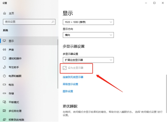 点击选择好作为主显示器的图标,然后下拉至多显示器设置处,勾选上“设为主显示器”。
