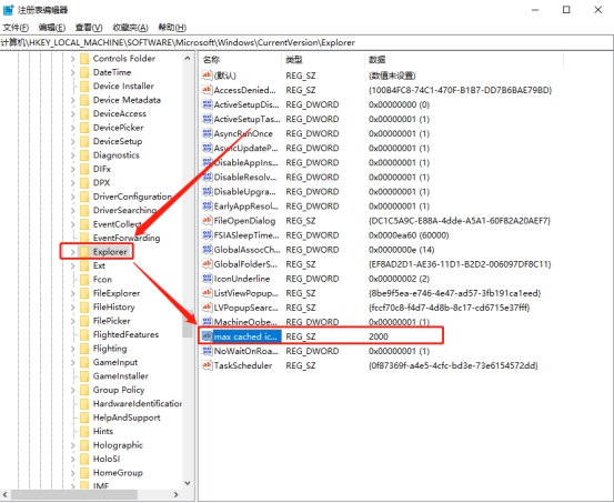 在“CurrentVersion”文件夹下找到并选中“Explorer”文件夹,在右侧菜单中再找到“Max Cached Icons”项。若在菜单中没有该项,直接右键点击空白处新建“字符串值”,并命名为“Max Cached Icons”即可。