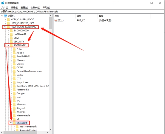 在注册表编辑器中依次打开“HKEY_LOCAL_MACHINE”文件夹、“SOFTWARE”文件夹和“Microsoft”文件夹。