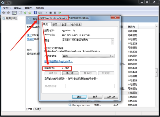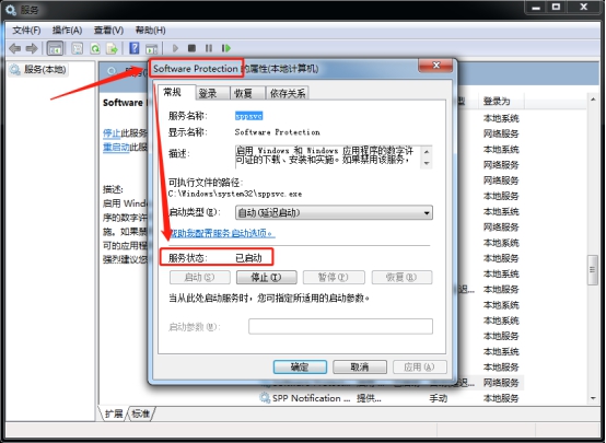 使用同样方法,找到并打开“Software Protection”和“SPP Notification Service”,在常规版面中将服务状态均修改为“已启动”即可。