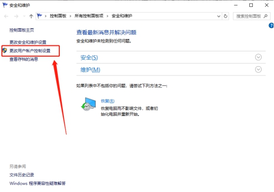 进入安全和维护设置页面后,再点击进入“更改用户账号控制设置”。