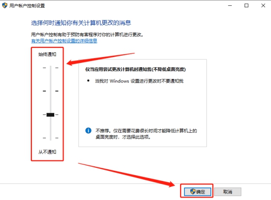 在用户账号控制设置页中,根据自己情况选择合适自己的配置(不建议直接选最底部的从不通知),最后点击确定即可。