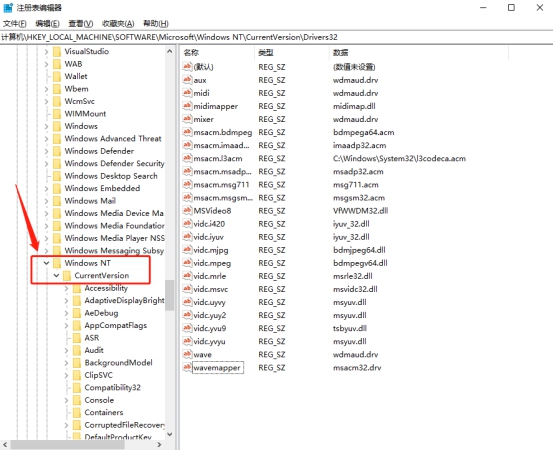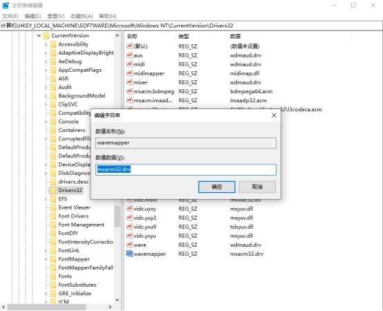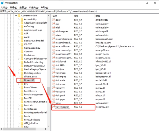 再继续找到并选中“Drivers32”文件夹,在右侧的菜单栏中查看是否有名称为“wavemapper”的文件。若没有该文件,则在空白处点击鼠标右键新建一个名为“wavemapper”的文件,并将其数值设置为“msacm32.drv”。