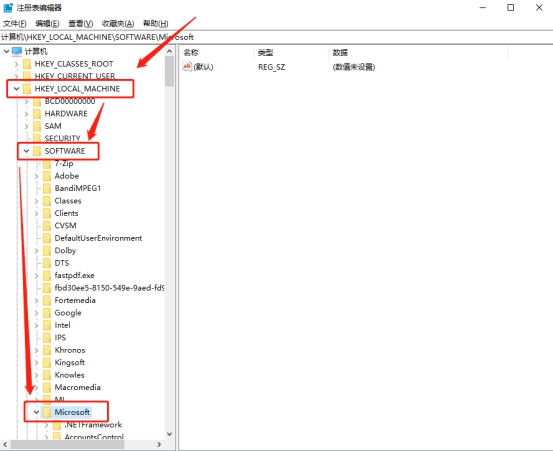 在打开的注册表中,依次打开“HKEY_LOCAL_MACHINE”、“SOFTWARE”和“Microsoft”文件夹。