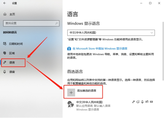 左侧菜单中切换至语言设置页,然后在右侧语言菜单中点击“添加首选的语言”。