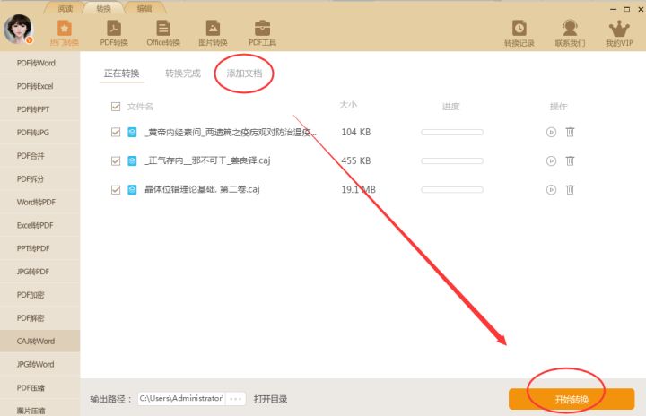 直接将所有需要转换的CAJ文档拖到转换页面后,点击左下角的输出路径设置转换后的文档保存位置,点击右下角的开始转换批量转换;