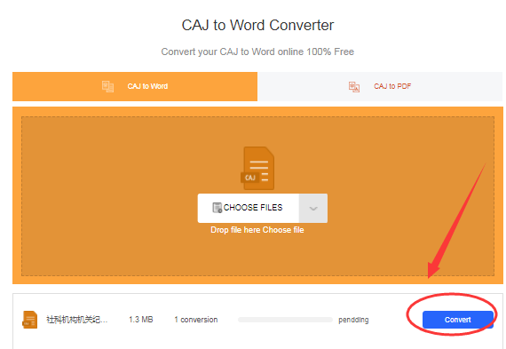第二步上传CAJ文档后,点击下方同步列表中进度条后面的convert开始转换;