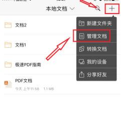 但是这样单次只能移动一个文件,如果文件比较多就比较耗时间,那么我们可以使用批量操作的方法。先点击阅读器右上角“+”中的“管理文档”,这时会发现所有的文件前出现一个小圈;
