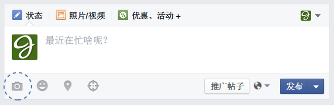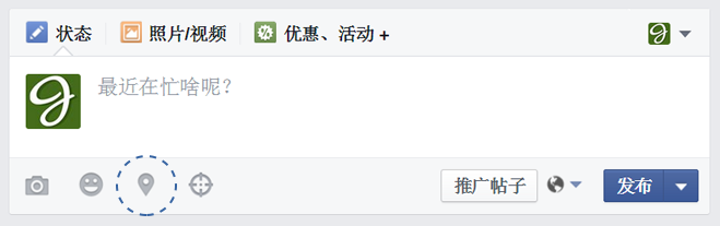 ● 点击地点图标,即可添加自己所在的地点。如果在不同的地点或在活动中发帖,此功能很有用。