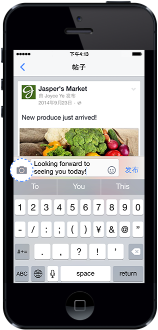 轻触“发帖”后,可以通过显示的键盘输入文本。轻触键盘上方的相机图标,可以添加照片应用中的照片并编辑这些照片。轻触时钟图标,可以设置排期帖,让帖子在预定时间显示。