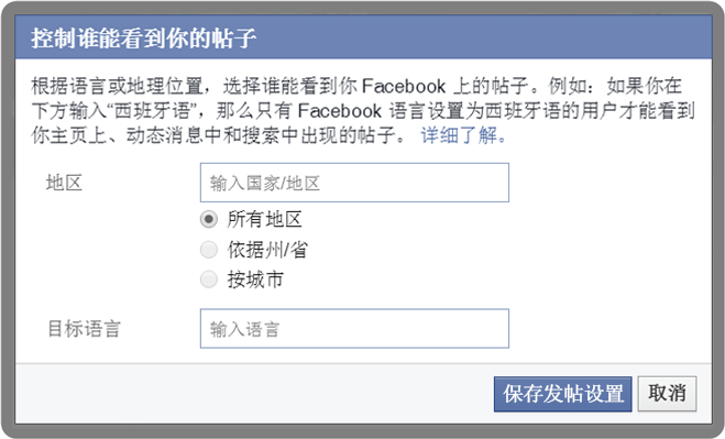 ● 点击“公开”按钮,然后选择“区域/语言”。选择显示帖子的地区和分享对象所使用的语言。