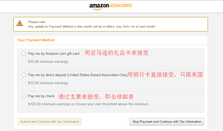 然后,我们会在注册邮箱里收到亚马逊发来的通过affiliate的申请,里头提供了三种不同的收款方式让你选择。