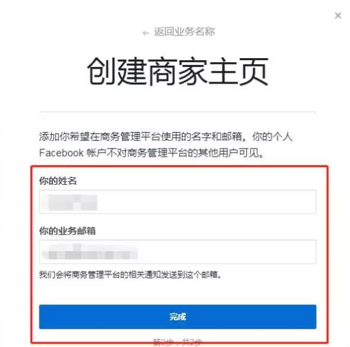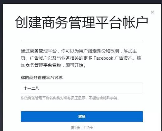 4. 首先,给自己的商务管理平台账户取名,这个是给自己看的,所以大家自己看着办就好哈。点击【继续】来到下一步。