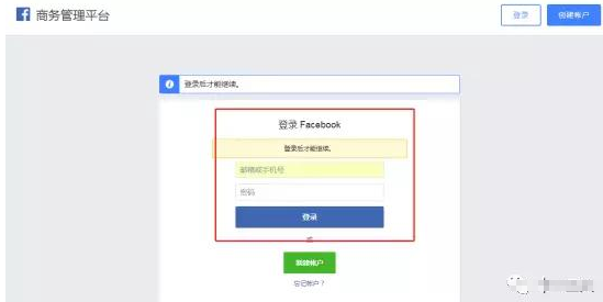 2. 登录个人Facebook账户,如果没有个人Facebook账户,选择【创建账户】。