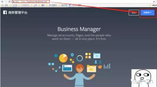 1. 登录business.facebook.com,注意没有www哈。我们首先需要用Facebook个人账号注册一个商务管理平台,在这里我们可以更方便的投放广告和分析数据。