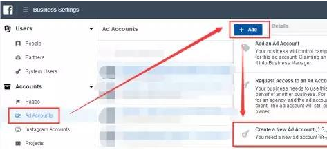 7. 在左边栏中,选择【广告账户】,点击【+添加】,如果没有任何广告账户的话,我们点击第三个按钮【创建一个新的广告账户】。