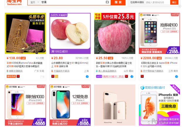 接下来,淘宝会对提取出来的商品进行类目的匹配。比如搜索“苹果”的时候,有“手机”,“生鲜”等类目: