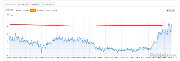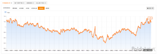 最后一个是竞争度:这个是统计每天开这个关键词的卖家竞争数有多少的一个指数化数据。这里我们选择最近的数据看一下就OK。这个数据也可以代表我们一年竞争情况的变化。