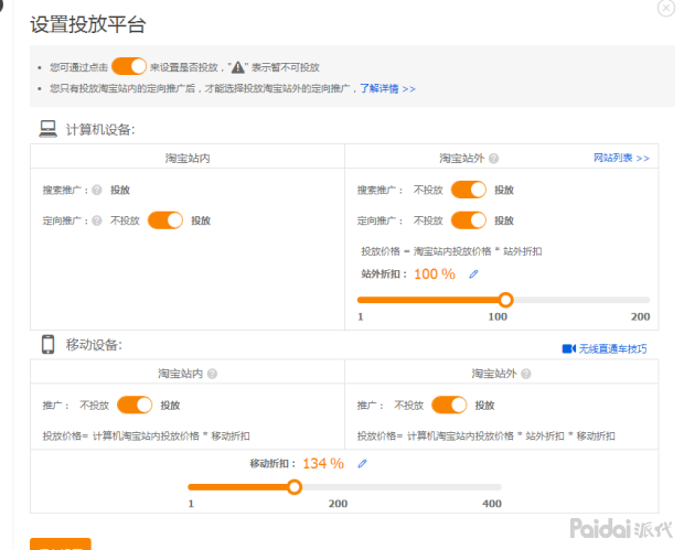 如果我们要开移动端推广计划的时候,一定要关掉淘宝站外这个入口,还有淘宝站内的计算机设备,把这些关掉。