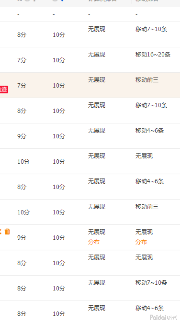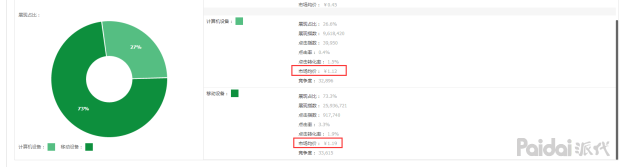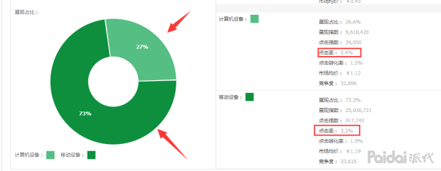②点击率:这里我们要看的是数据透视里面过去一周的数据,这样的数据具有一定的参考意义。如果你开移动端的话,就看移动端,如果开PC端,就看PC端的。这里我们还可以得到一个重要的信息,是关于设备的展现问题,如果你开PC端,那么移动设备占比高的可以不考虑开,但是如果你要开移动端的话,也一定要注意这个投放设备展现占比的问题。