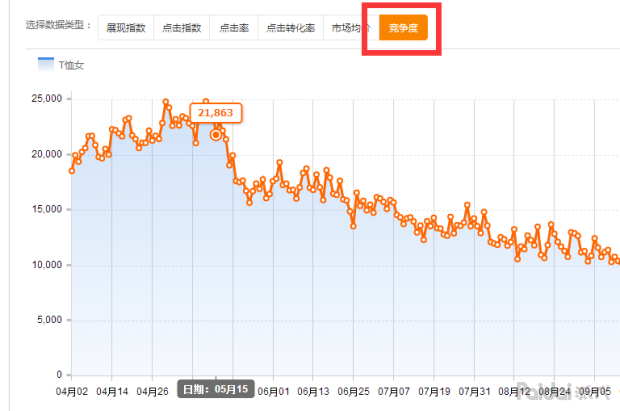 再看点指数:这个点击量同样也代表着市场的需求,而我们通过直通车得到的数据是在这个关键词下我们的直通车所能获取到的点击量的指数化数据。