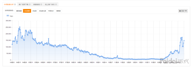 然后是点击率:这个点击率的走势,是我们用来判断一个关键词的点击率在过去一年中的变化趋势,其中我们以最近的数据来判断这个词的点击率是否能够稳定,这里我们很明显,要选择稳定的词。