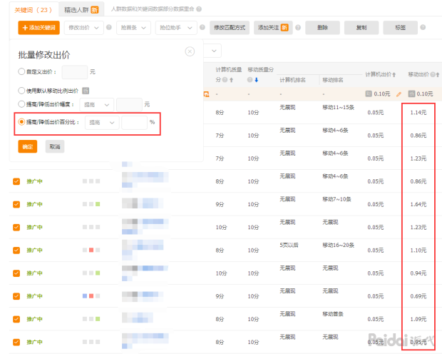 这里我们关键词的出价,要以每个关键词的行业均价为标准,关键词先出行业均价,然后我们把所有的移动出价调整为行业均价以后,然后全选批量改价,在左上角有一个批量调价,这里我们选择百分比,出行业均价的1.5倍就可以,有的如果行业均价高,就可以少量的调整一下。