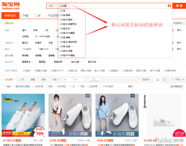这里面做一个总结:核心词是目标词延伸的关键词,等于一个落地词,落地词是做排名强权重的关键。有的人不知道目标词是什么?它是主打主推的词,是非常落地的词。比如小白鞋,小白鞋是目标关键词,确定好目标词在搜索一下在下拉框里核心词的1级延伸词。