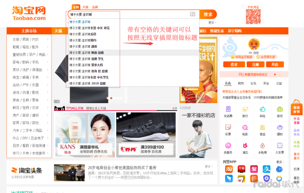 比如:裙子女夏 连衣裙这个词比裙子女夏连衣裙的搜索的人多,所以我们要使用带有空格的裙子女夏 连衣裙这个关键词,需要使用插入原则,是带有空格的关键词具有紧密排列的特征。