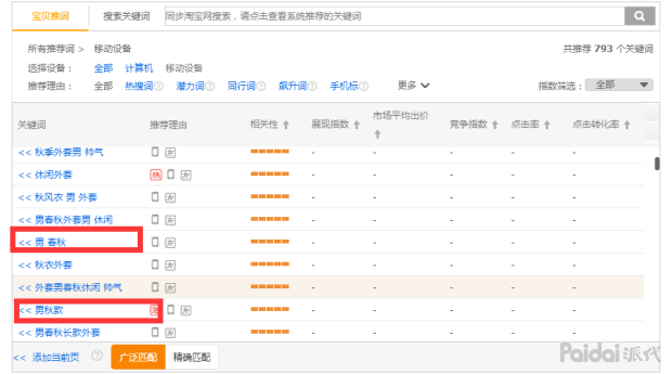 在淘宝上有一类关键词是不能使用精准匹配的,就是淘宝系统推荐的一些关键词,系统推荐的这些关键词很多是买家从来不会这样去搜索的,像男外衣、男秋款 之类的关键词,这些关键词实际上买家这样去搜索的可能性不大,但是淘宝系统会这样去推,所以这种词是不能用精准匹配的,因为用了精准匹配就会没有流量,但是用了广泛匹配的话,你会带来很多很便宜的流量,一般淘宝系统在推的关键词虽然转化率不太高,但是他的流量很大,而且还便宜,一般这种词前期是不建议开的,后期开。