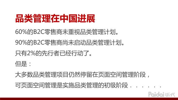 网购竞争必将越来越惨烈,渠道数量又会增多,整体效益却在下滑,怎么办?促销的作用将会越来越不凸显,做促销找死,不做促销等死,怎么办?各网站之间相互无序打价格战,价格已经不能再低,毛利已接近负数,怎么办?B2C粗放式管理的时代一去不复返,精细化管理越发重要,尤其是商品侧,也就是品类管理。