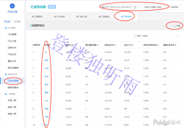 然后,我们通过市场行情行业热词榜热门修饰词来找到常用属性词。把和我们产品不相关的属性词排除,留下跟我们产品相匹配的关键词。