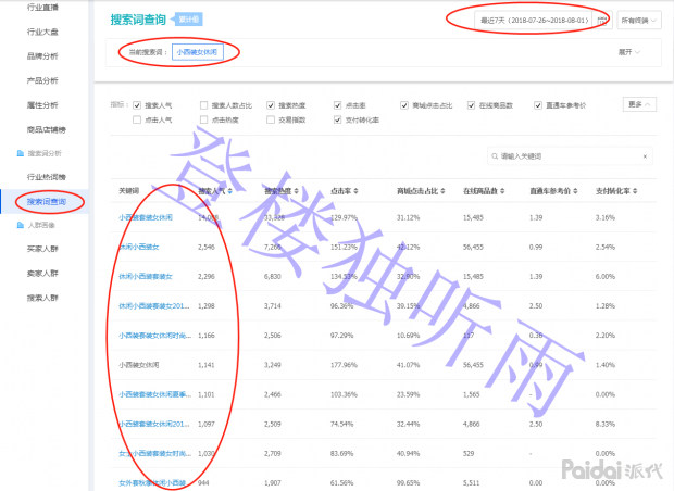 确认核心关键词的方式有很多,市场行情行业热词榜热门搜索词或者商品店铺榜,热销宝贝的最近热门引流词,一般流量最大,字数比较少的就是宝贝的核心关键词。因为衣服是针对女性,所以最终确定我们的核心词是,小西装女;西装女;小西服女;西服女这四个关键词。