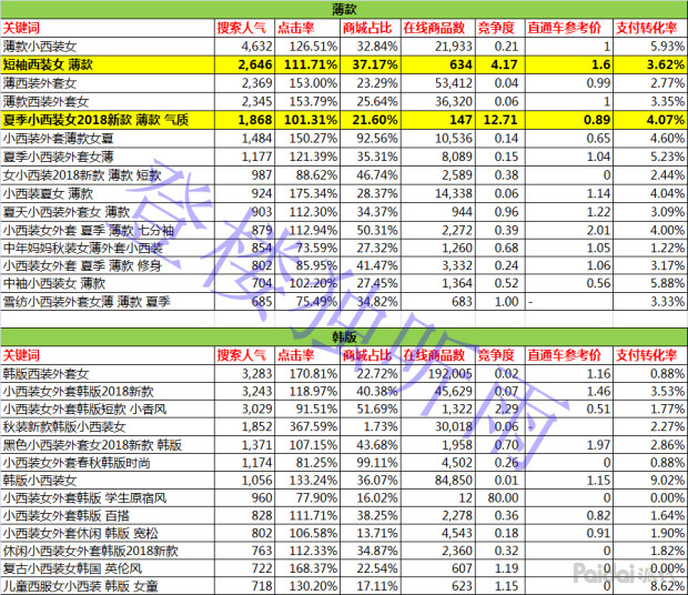 1、一个关键词,完全匹配的权重大于部分匹配的词。比如说“小西服2018新款女“这个词,还有“小西服薄款韩版2018新款女”,“小西服2018新款”在第一个词中的权重就高于在第二个词中的权重。